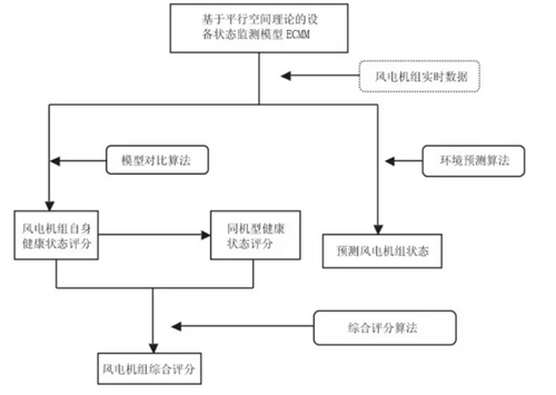 基于ECMM模型的风电机组健康状况评估方法主要分四个阶段:风电机组自身健康状态评分、同机型健康状态评分、风电机组综合评分、健康状态预测。其中风电机组实时数据作为模型的输入数据,利用模型对比算法得到同机型健康状态评分、自身健康状态评分,最后需要综合评分算法计算出风电机组综合评分。利用环境预测的算法来预测风电机组的状态。