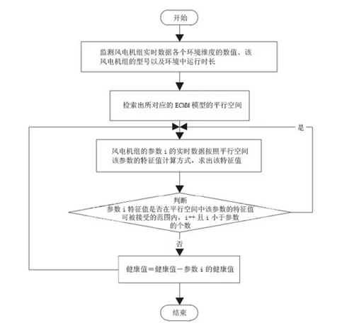 利用风电机组的实时监控系统对风电机组全参数进行监测。并根据此时环境各维度的值以及风电机组在当前环境中运行时长来检索相应的ECMM模型中的平行空间。并根据平行空间中风电机组参数计算特征值的方式,求出此时风电机组相应的各个参数的特征值。每当有一个参数的特征值不满足平行空间中所给出该参数特征值的健康范围,则健康值需要减去该参数的权重值以及相应每个参数所需要减掉的参数值,剩余的健康值即为该时刻风电机组运行的健康值。